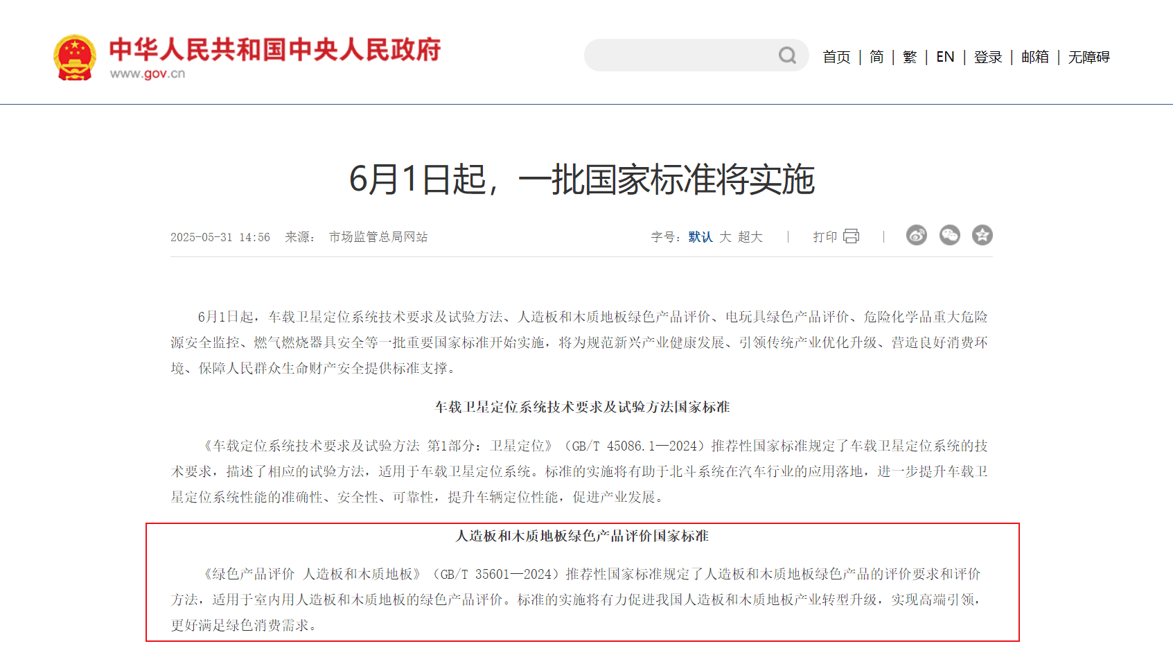 GB/T 35601—2024《绿色产品评价 人造板和木质地板》于2024年11月28日由国家市场监管总局、国家标准委发布,2025年6月1日实施。